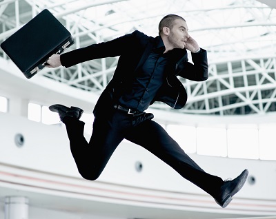 Young businessman jumping in midair with cell phone and briefcase
