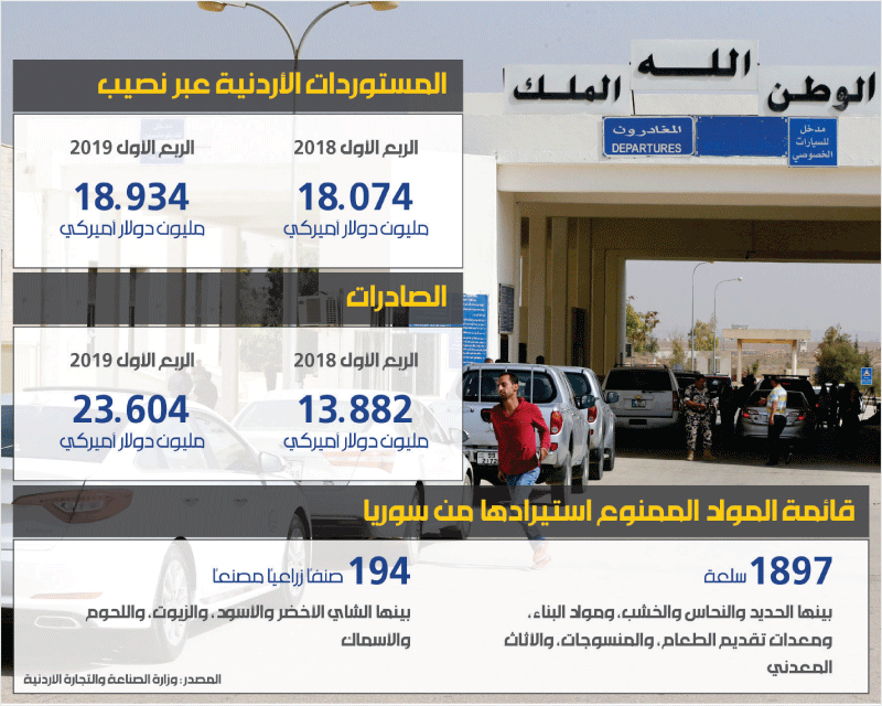 يعلّق أمين سر «نقابة أصحاب شركات ومكاتب التخليص ونقل البضائع في الأردن»، جمال بشابشة، على ذلك بقوله إنه «لا شيء يتم استيراده بشكل فعلي. الأصناف المسموحة لا يتم استيرادها من سوريا أصلاً… أما السلع غير المدرجة فممنوع استيرادها، ويجب على التاجر مراجعة وزارة الصناعة والتجارة للحصول على رخصة استيراد». ويلفت بشابشة إلى أن «تنفيذ الحصار عبر الأردن تسبّب في ضرر كبير للتاجر الأردني الذي انتظر استقرار الأوضاع فترة طويلة». هكذا، انتصبت الجدران الأميركية، سريعاً، أمام منفذ اقتصادي شكّل تفعيل العمل فيه لأهالي البلدين فسحة أمل، لكن ذلك لم يسهم في تحسين النسب عما كانت عليه خلال السنوات الماضية، حيث انخفضت الصادرات الأردنية إلى سوريا مثلاً ما بين عامي 2011 و2017 بنسبة 80%، فيما انخفضت المستوردات السورية إلى الأردن خلال الفترة نفسها بنسبة تجاوزت 82%. وبشكل عام، عانى الميزان التجاري الأردني طيلة تلك السنوات عجزاً في التبادل التجاري مع سوريا، ولكن المفارقة كانت في عام 2015 عندما شهد الميزان التجاري فائضاً بقيمة تقريبية وصلت إلى نحو 36 مليون دولار، مع أن معبر نصيب «كان تحت سيطرة الجماعات المسلحة» في ذلك الوقت.