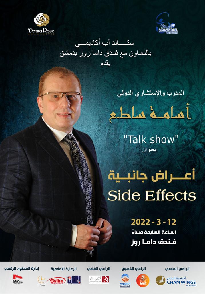 يستمر مشروع “ستاند أب أكاديمي” للاستشاري والمدرب الدولي “أسامه ساطع” في نشاطه لهذا العام ومن خلال فعالية بعنوان “Side Effects” أو “أعراض جانبية” والتي ستقام قريباً بفندق داما روز دمشق بإذن الله.