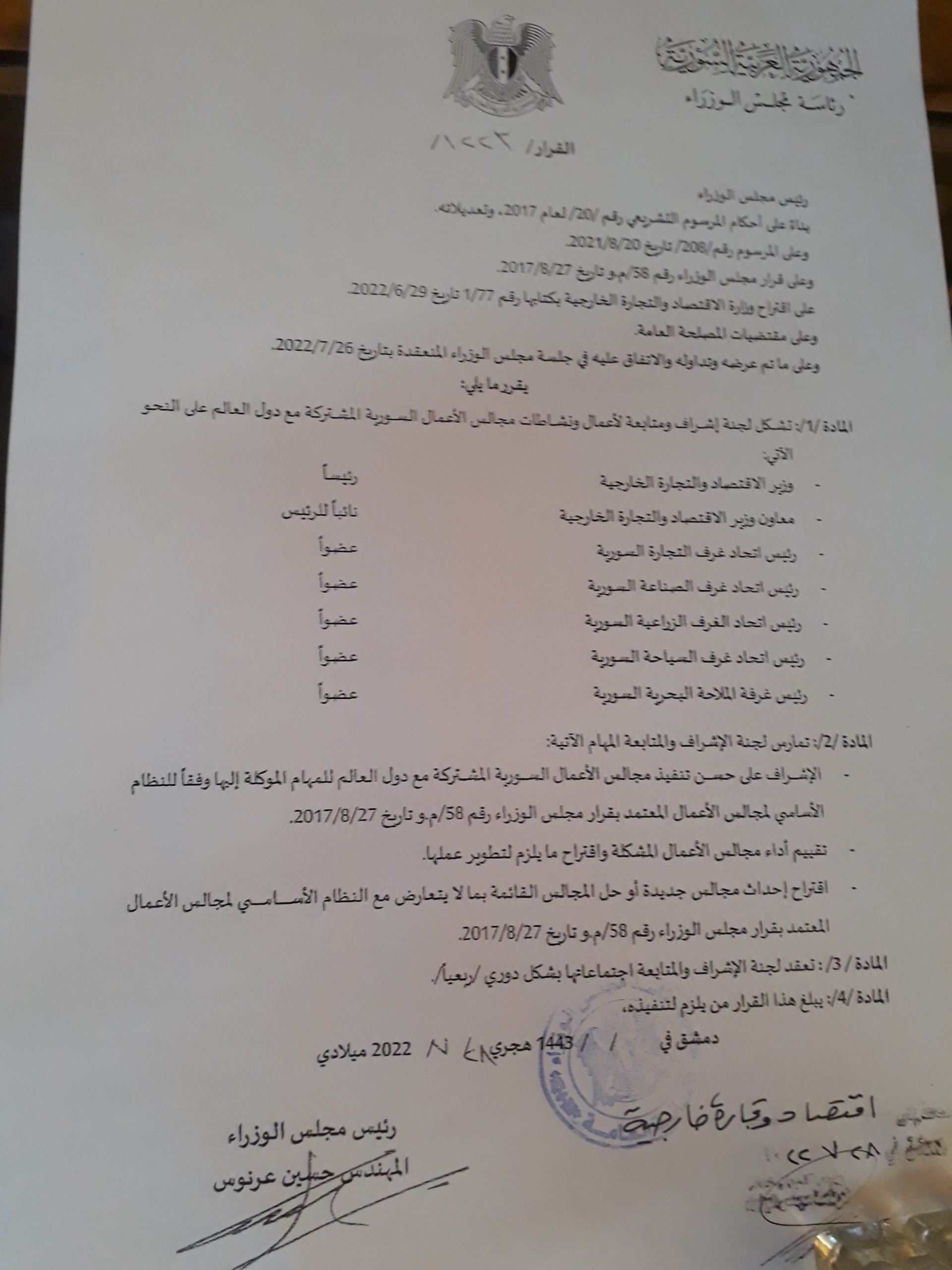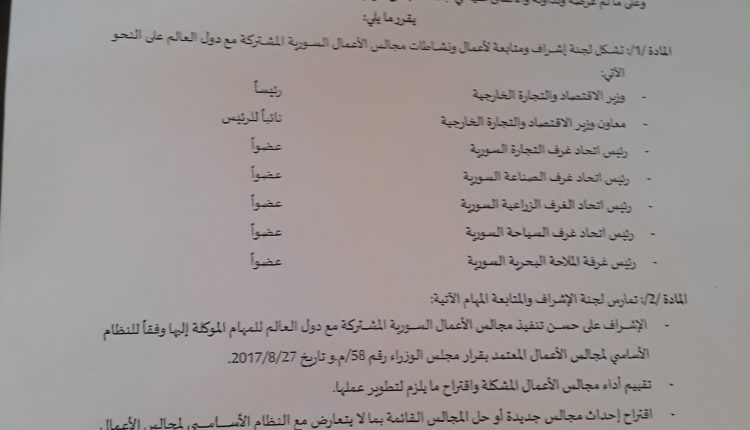 أصدر رئيس مجلس الوزراء المهندس حسين عرنوس قرارا يقضي بتشكيل لجنة للإشراف ومتابعة أعمال ونشاطات مجالس الأعمال السورية المشتركة مع دول العالم .