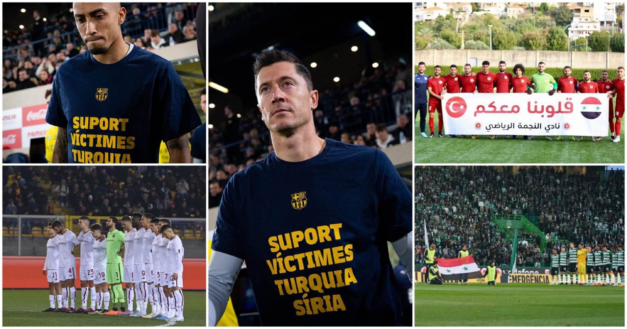 حيث وقف اللاعبون في لقاء “برشلونة” و”فياريال” ضمن الدوري الإسباني لكرة القدم دقيقة صمتٍ على أرواح الضحايا في الكارثة، كما كان اللاعبون يرتدون عند دخولهم أرض الملعب قمصان كتب عليها دعم المتضررين من الزلزال.
